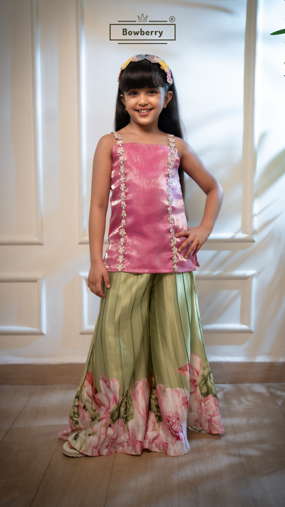 A striking ensemble that blends elegance with ease. The liquid organza top glimmers with fluid grace, perfectly balanced by the rich sheen of high-quality Japan satin bottoms. Accented with floral details and contrasting hues, it captures the essence of festive sophistication. Finished with a butter crepe lining for comfort, this set is as effortless to wear as it is captivating to behold—making it a timeless choice for celebrations.
