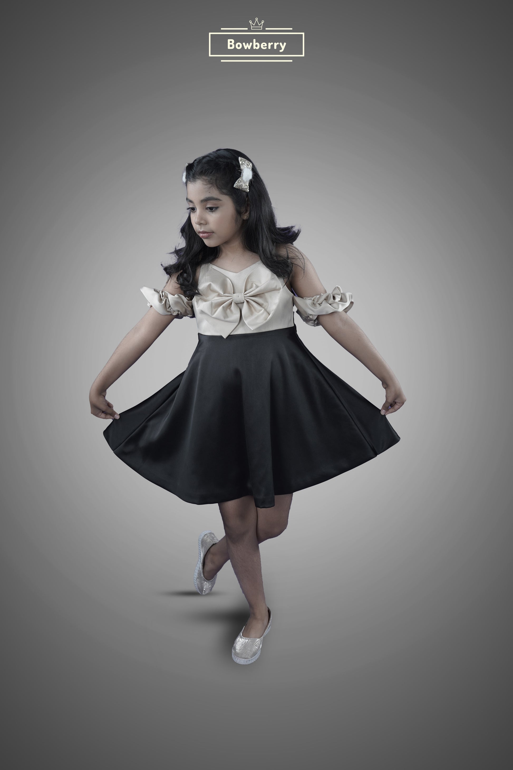The off-shoulder silhouette paired with a grand statement bow adds instant charm, making it an ideal pick for winter parties, celebrations, and those picture-worthy festive moments. The smooth satin falls beautifully, giving the dress a soft, graceful flow with every step.