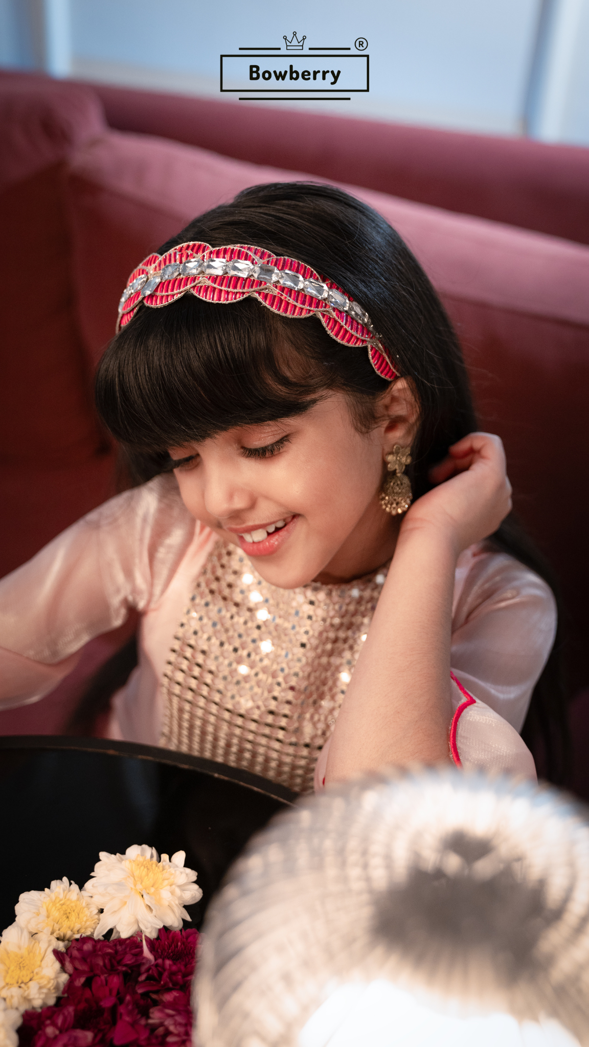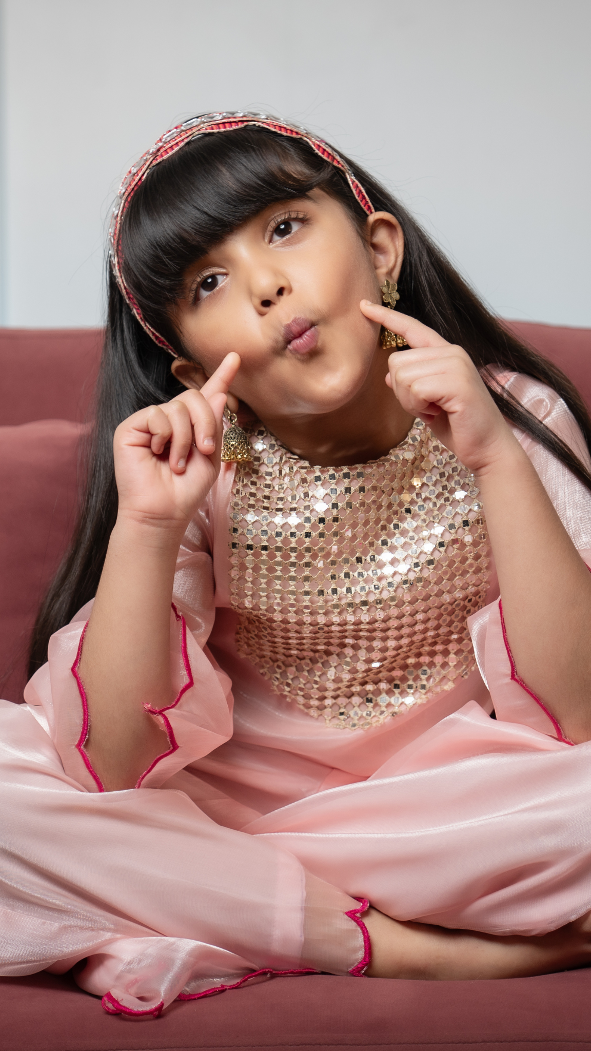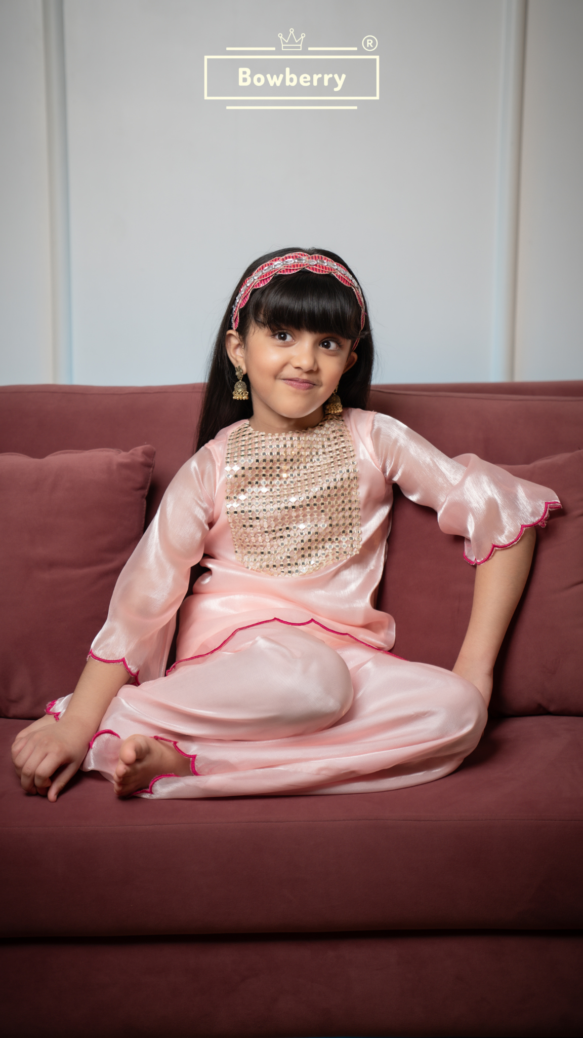 Crafted in liquid organza, this set shimmers with delicate charm and festive elegance. The scalloped edges adorned with mirror embroidery add a playful yet refined touch, while the butter crepe lining ensures all-day comfort. Including a coordinated top and bottom, this ensemble beautifully balances style and ease—perfect for festive occasions that call for effortless glamour.