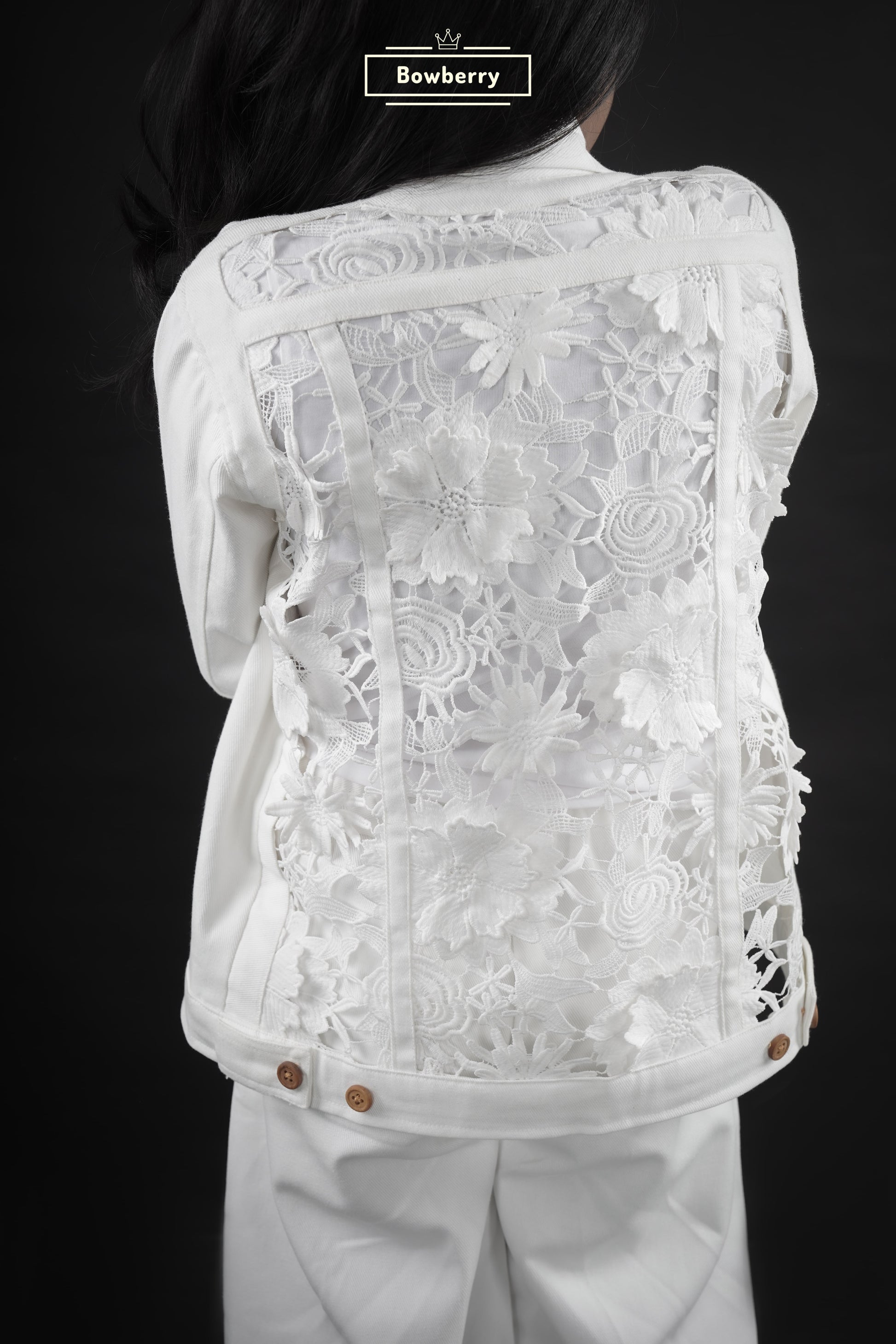 The shirt-style denim jacket doubles as a top, featuring an exquisite embossed cutwork floral back that adds softness to the classic denim look. Paired with our cute loose Korean pants, designed with a comfort-fit elastic at the back, this outfit brings effortless style and easy movement together.